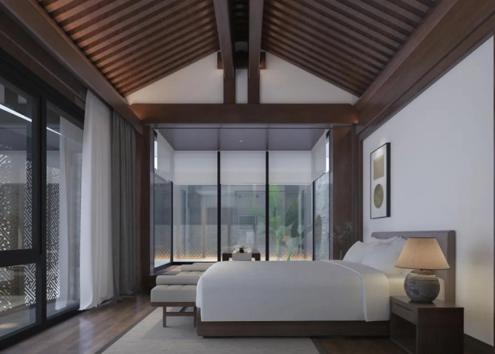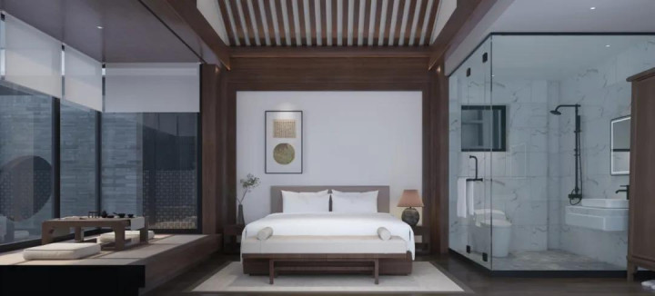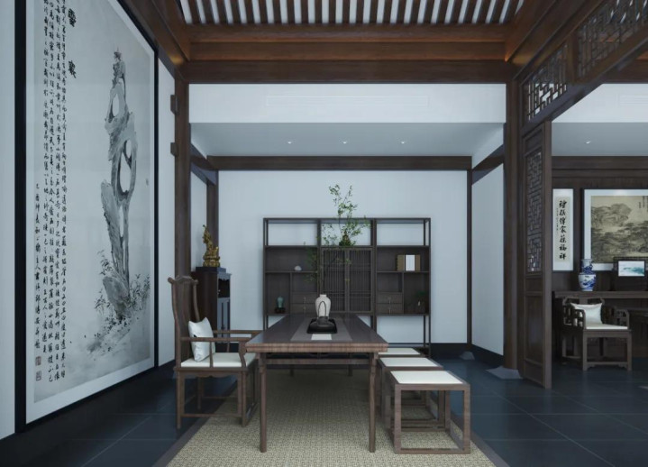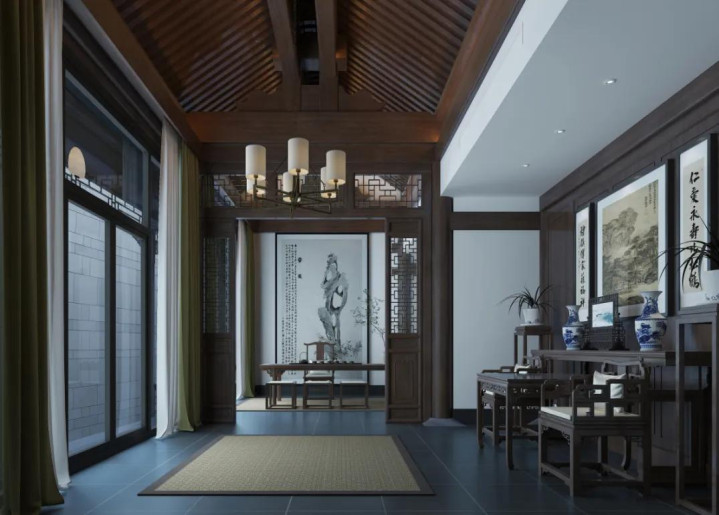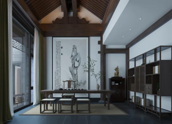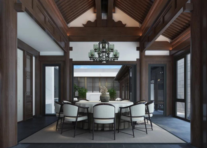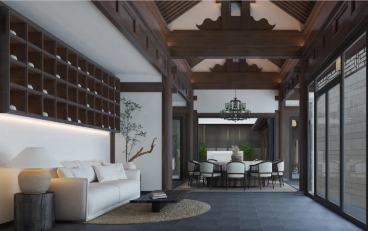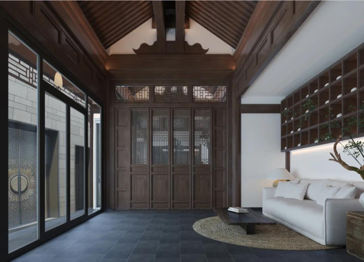 倒座房功能升级:传统倒座房多作佣人房或储藏室,新中式常改造为 茶室、书房或客房,面向庭院开大窗,引入景观。
